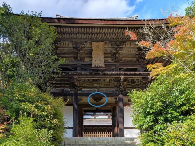下層冠木上の欄間には両面ともに花肘木があしらわれ、上記の写真で確認できる正面は蓮唐草浮彫の中央、蓮華上の月輪にキリクを刻み、背面は牡丹唐草浮彫の中央、牡丹花上に宝珠を刻み、いずれも天竺斗に載っています。