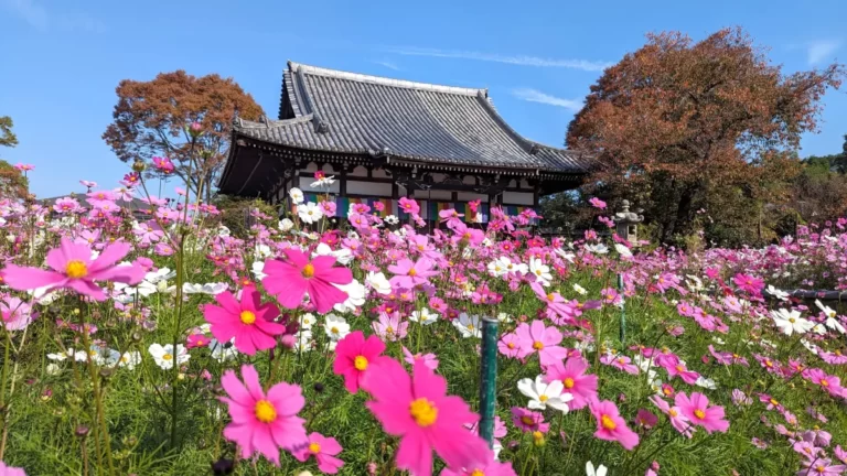 般若寺(奈良県奈良市)の紹介です。境内を埋め尽くすコスモスや国宝楼門が見どころです。